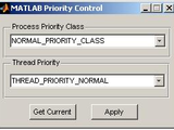 With this tool you can set the MATLAB(R) process priority class and the thread priority. You can also set priorities for other programs from MATLAB (new feature). It is possible to use the commands set_priority and get_priority directly or you can use the convientent user interface. To install just unzip and add the directory to your matlab path. Use the highest priorites with care since they might block out your mouse and other basic fuctionality in windows.