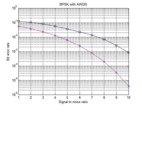 comparison between theoretical vs practical bit error rate in BPSK(AWGN).
